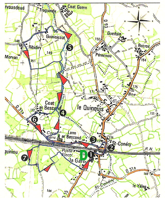Les moines cisterciens de l'abbaye de Bégard, édifièrent dans ce village, une chapelle (XVI Sc), d'abord dédiée à St Gonery, puis à Ste Anne vers 1650 ( en façade leurs armoiries, au dos une fontaine), en contre-bas leur moulin, autrefois alimenté par un étang sur le Guindy.